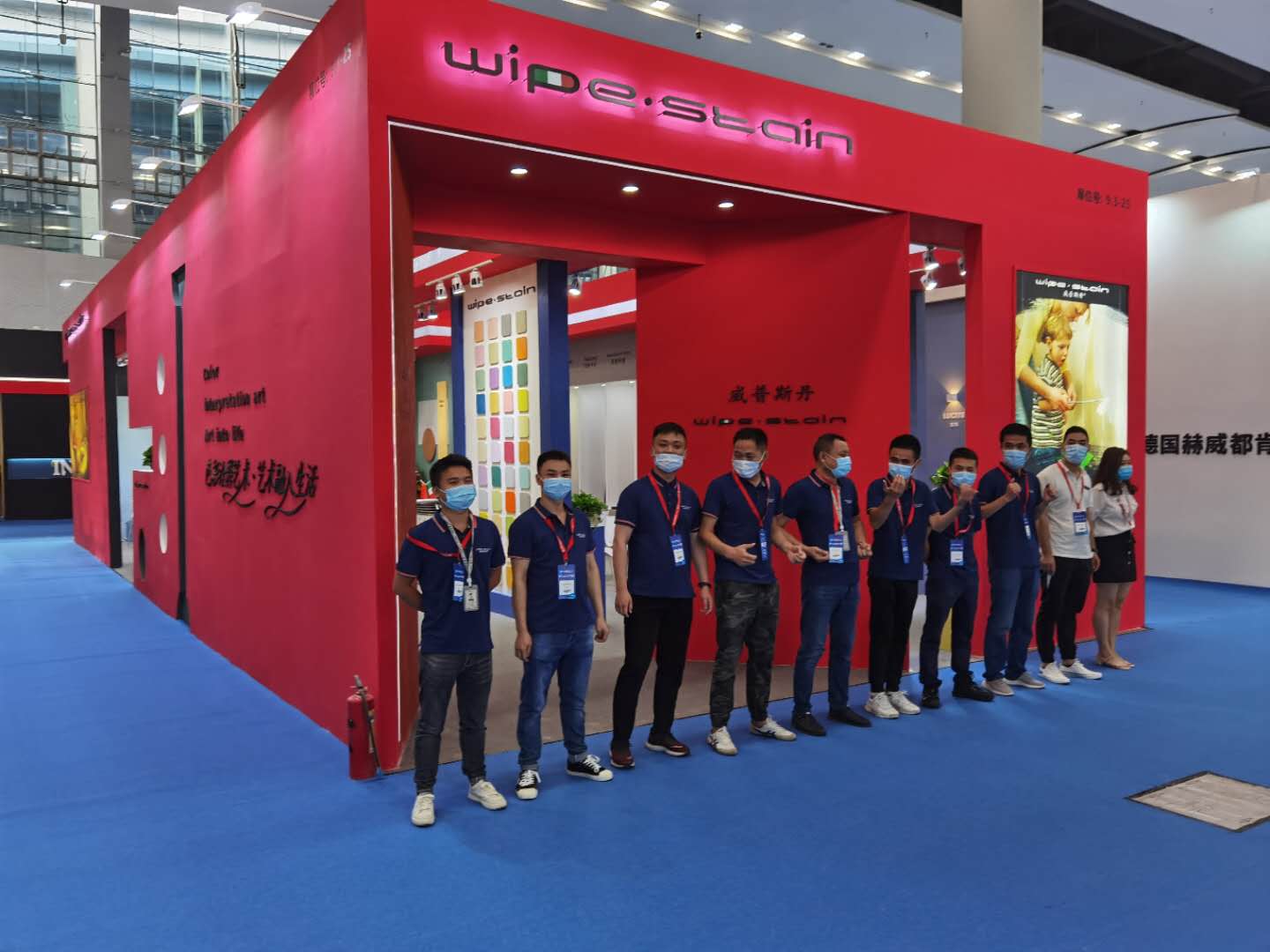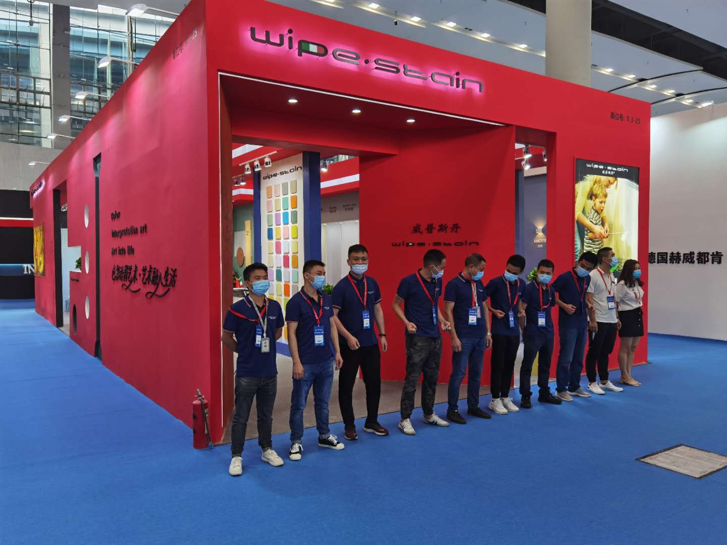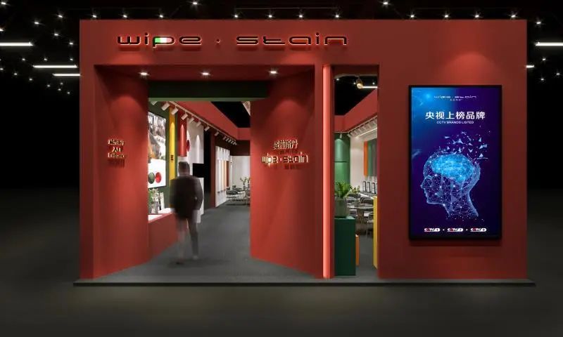 展馆外墙用的这个涂料正是本次展会主推的产品系列之一(Superbianco Extra 苏伯利亚)。红色的蛋壳光色彩冲击,寓意艺术涂料市场的红红过火,正如开展首日,威普斯丹(Wipe stain)就喜迎“开门红”一样。
