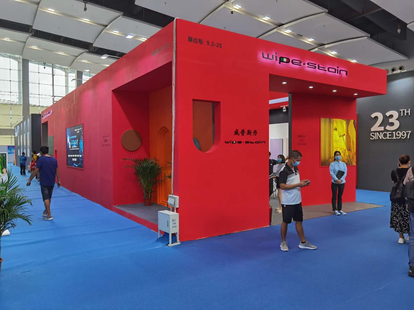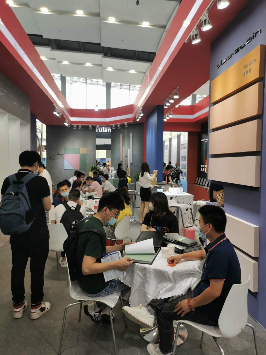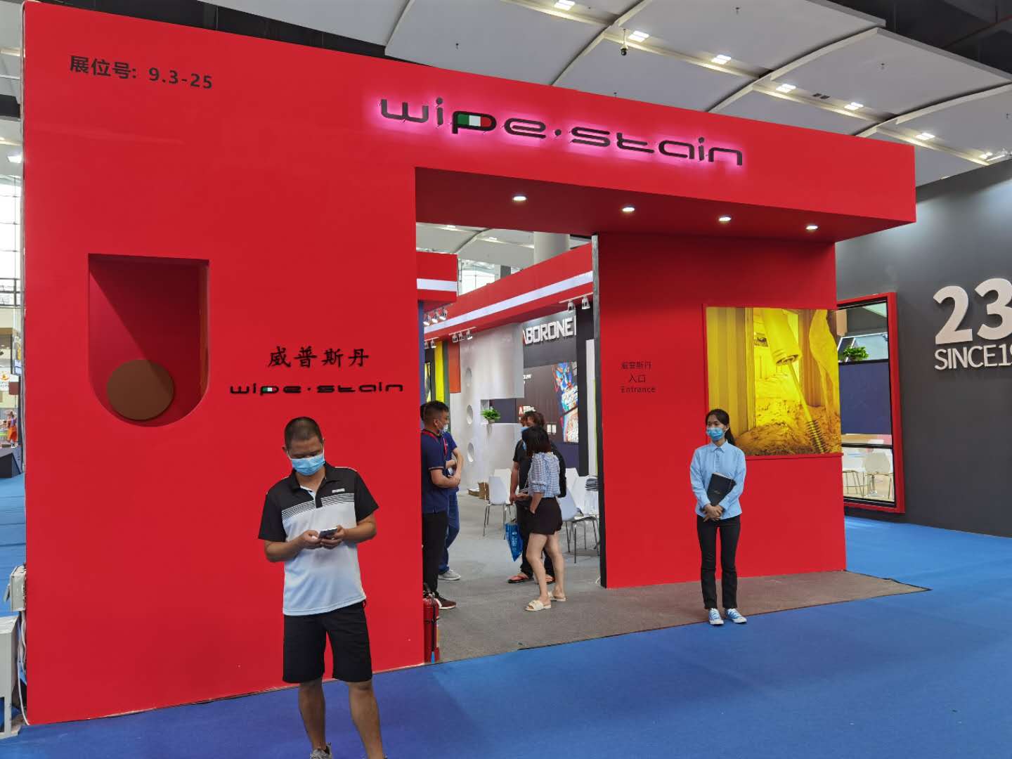 展馆外墙用的这个涂料正是本次展会主推的产品系列之一(Superbianco Extra 苏伯利亚)。红色的蛋壳光色彩冲击,寓意艺术涂料市场的红红过火,正如开展首日,威普斯丹(Wipe stain)就喜迎“开门红”一样。