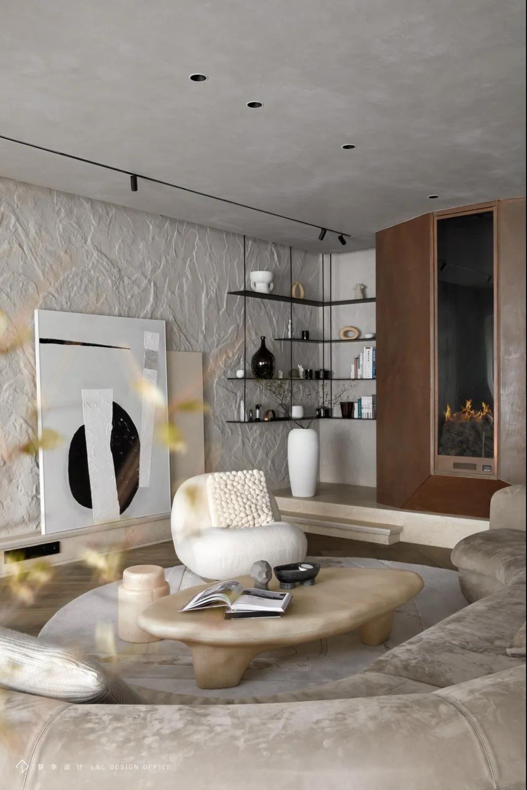 WIPESTAIN艺术涂料水泥质感的的背景墙面充满了雕塑形式的力量感、立体感、稳定感,不同的空间各自具有独立的气场,却又彼此交融。