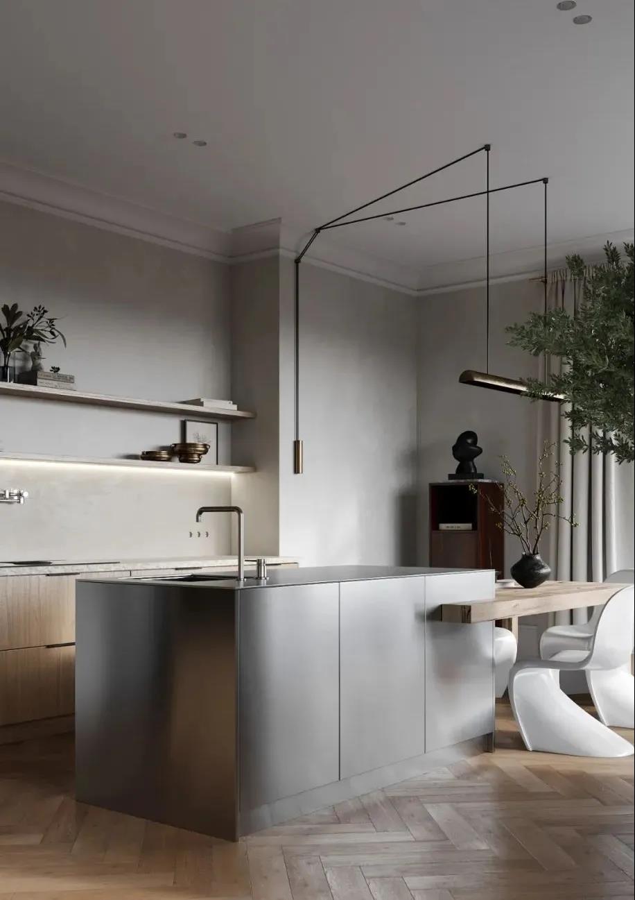 吸引人的住宅设计,一定是基于居住者本身的习惯、喜好以及切身感受的设计。家的布局应该是以人为中心。打破传统的布局思维,将WIPESTAIN艺术涂料延伸至整个墙面,使空间展现出如水的延续性。